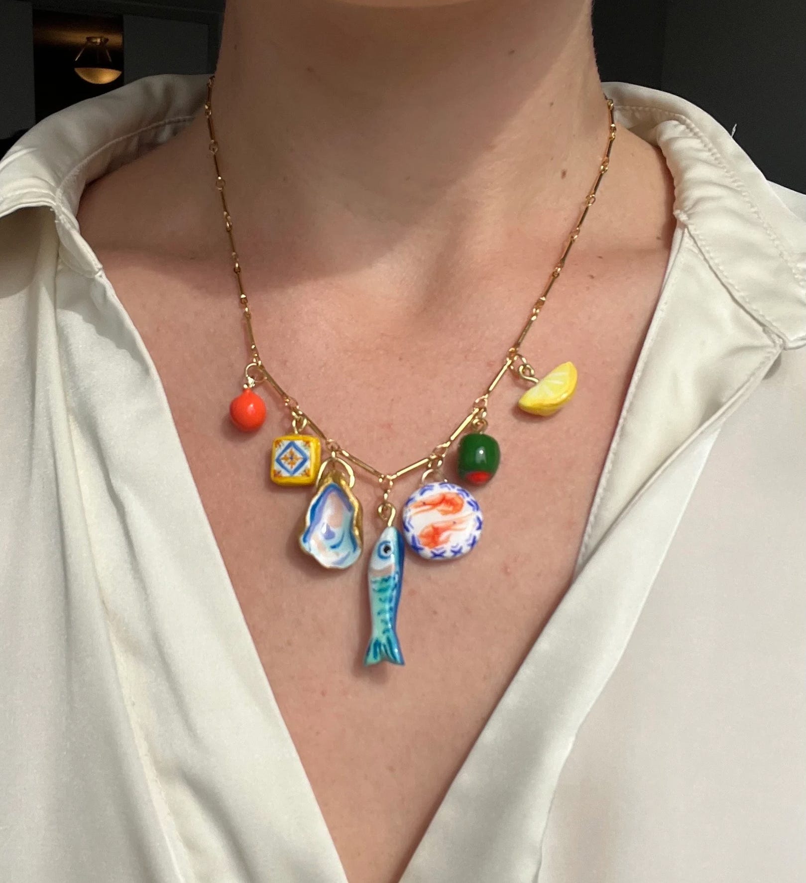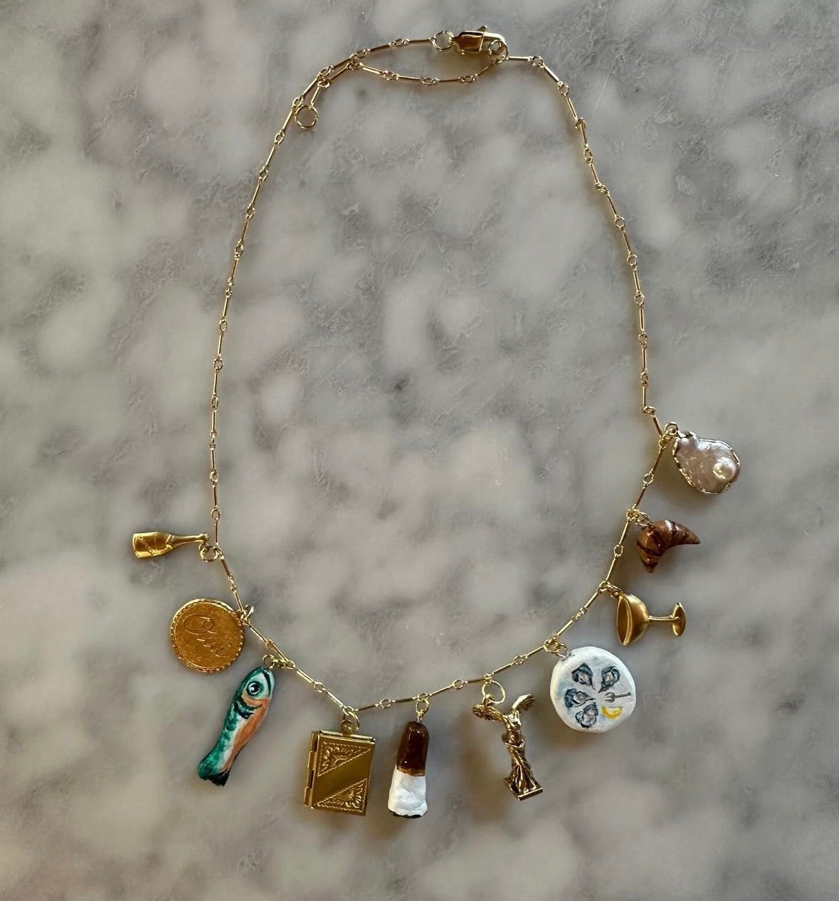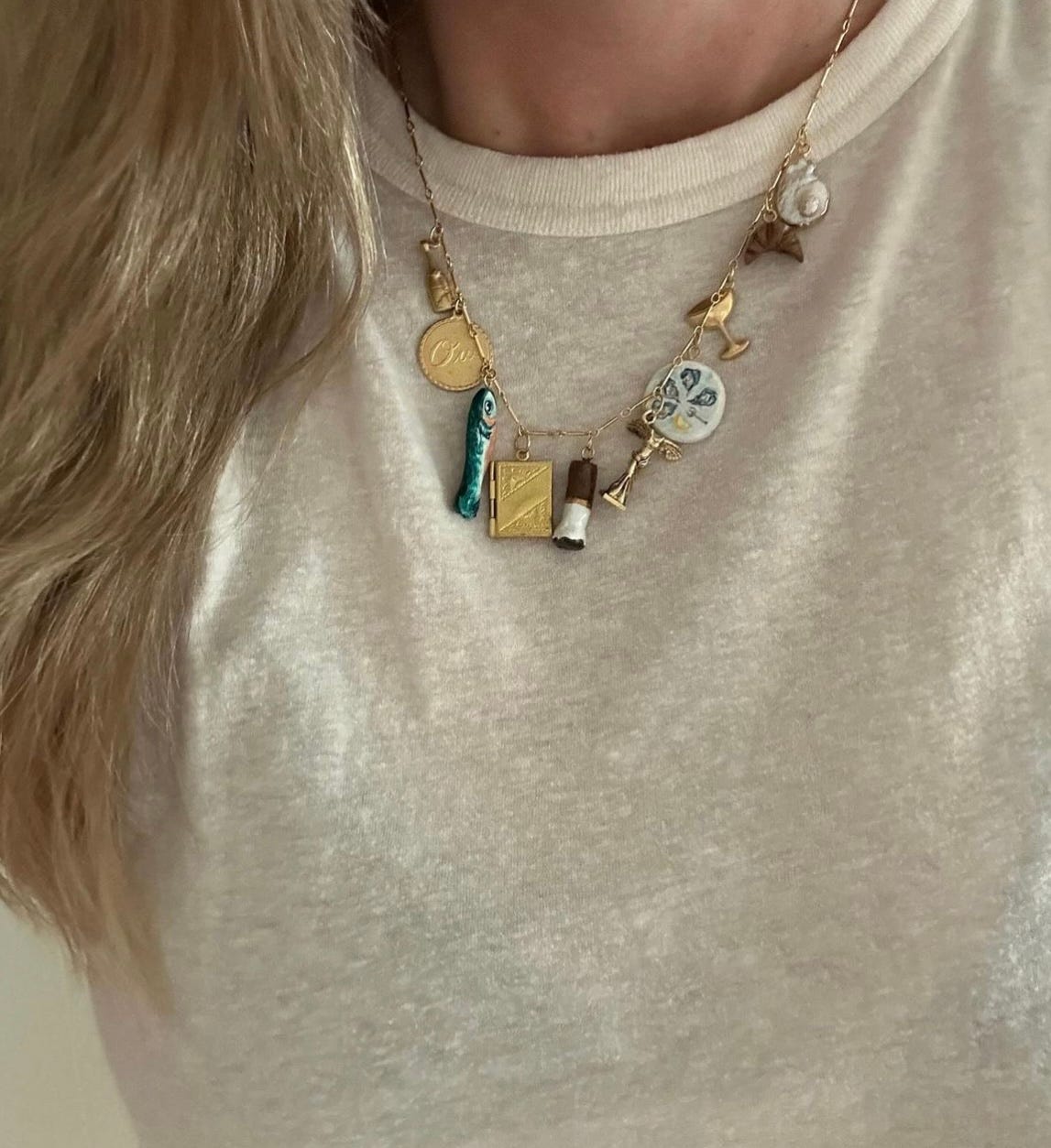 Speaking of birthday gifts, my current charm necklace crush is thanks to my friend Amanda Zurita, who has been making the coolest charm necklaces all summer. She surprised me with one for my birthday last month, and I literally cried when I opened the package—such a special, personalized gift. The necklace is a mix of vintage and modern charms that Amanda has collected, including a champagne bottle and coupe, paired with whimsical clay charms that she makes and then paints, like a plate of oysters, a croissant, a stick of butter, and even a cigarette butt (who knew that could be so charming?!).