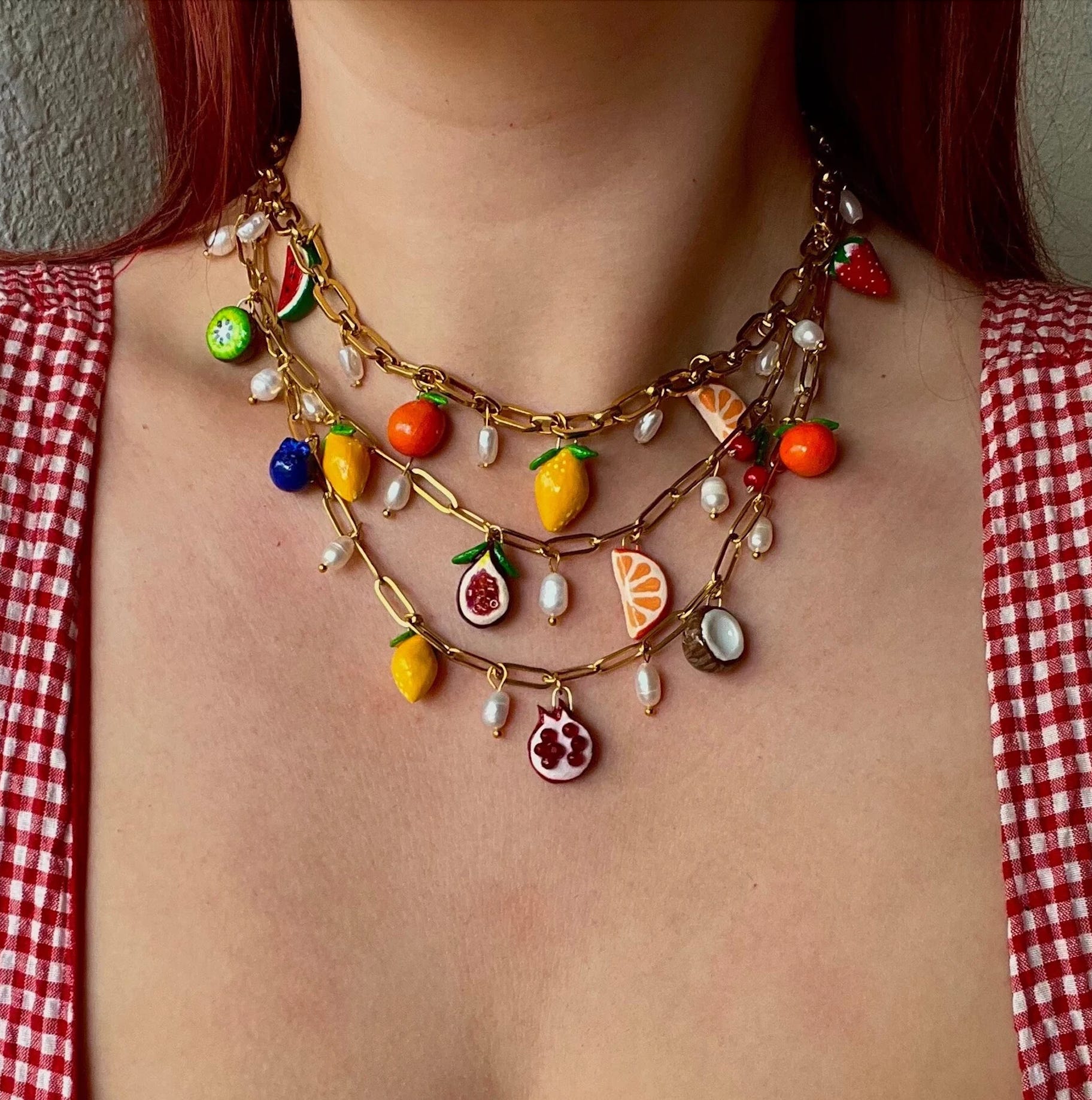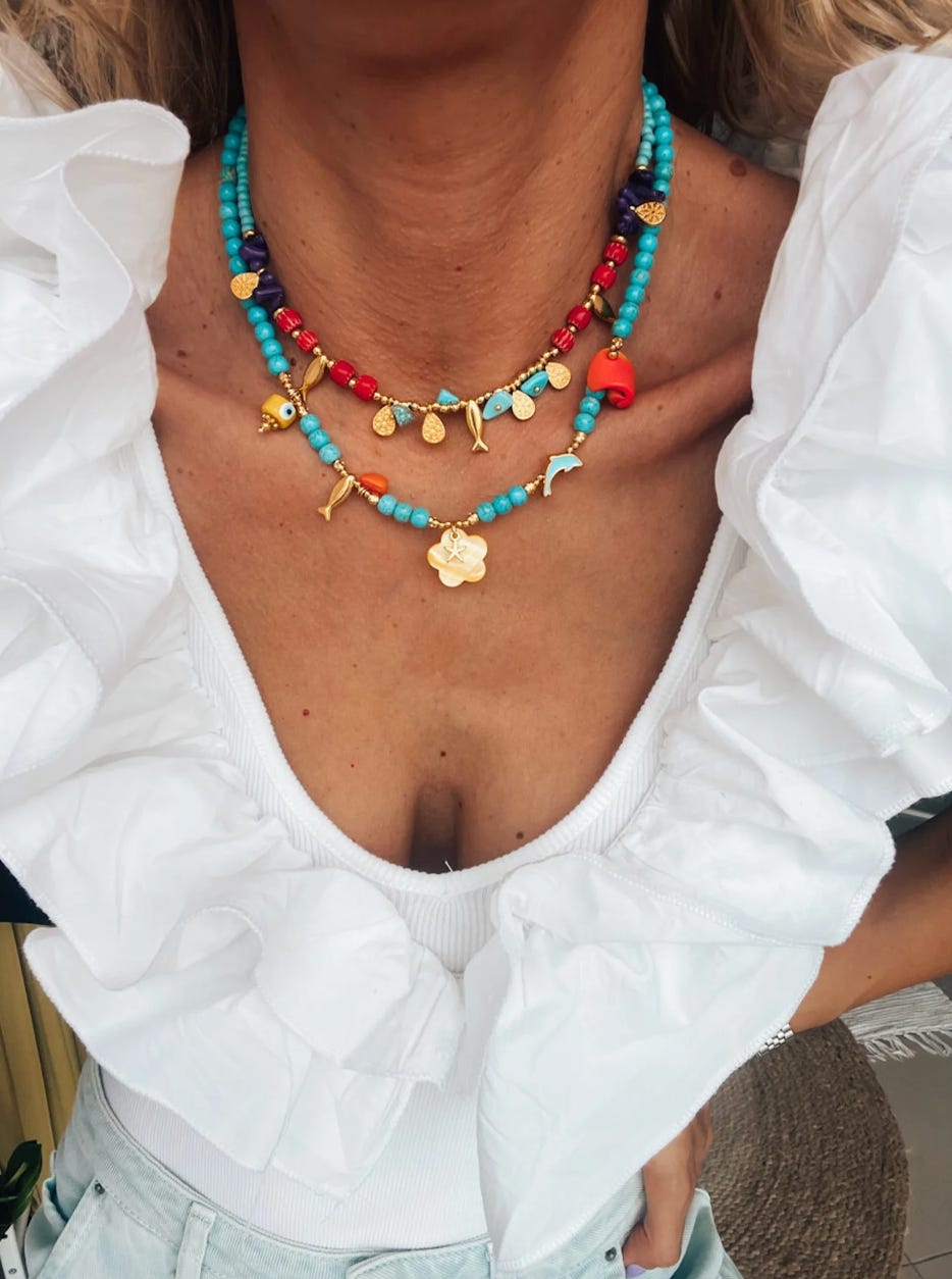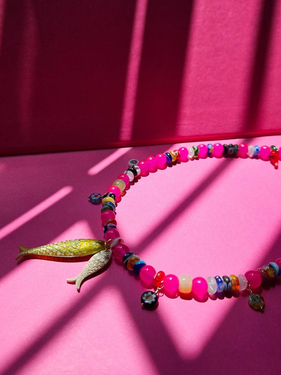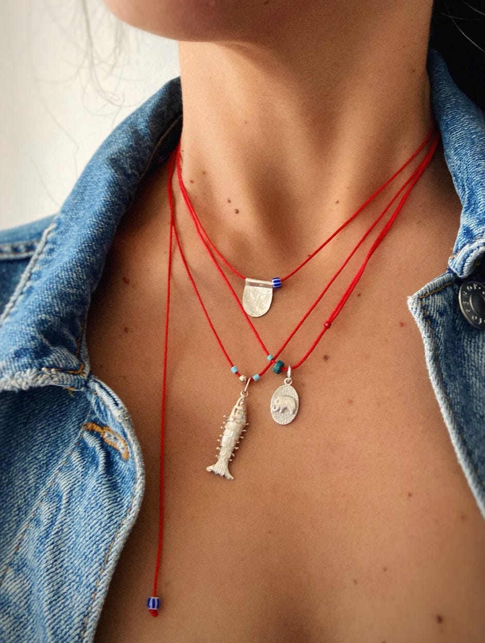 Speaking of birthday gifts, my current charm necklace crush is thanks to my friend Amanda Zurita, who has been making the coolest charm necklaces all summer. She surprised me with one for my birthday last month, and I literally cried when I opened the package—such a special, personalized gift. The necklace is a mix of vintage and modern charms that Amanda has collected, including a champagne bottle and coupe, paired with whimsical clay charms that she makes and then paints, like a plate of oysters, a croissant, a stick of butter, and even a cigarette butt (who knew that could be so charming?!).