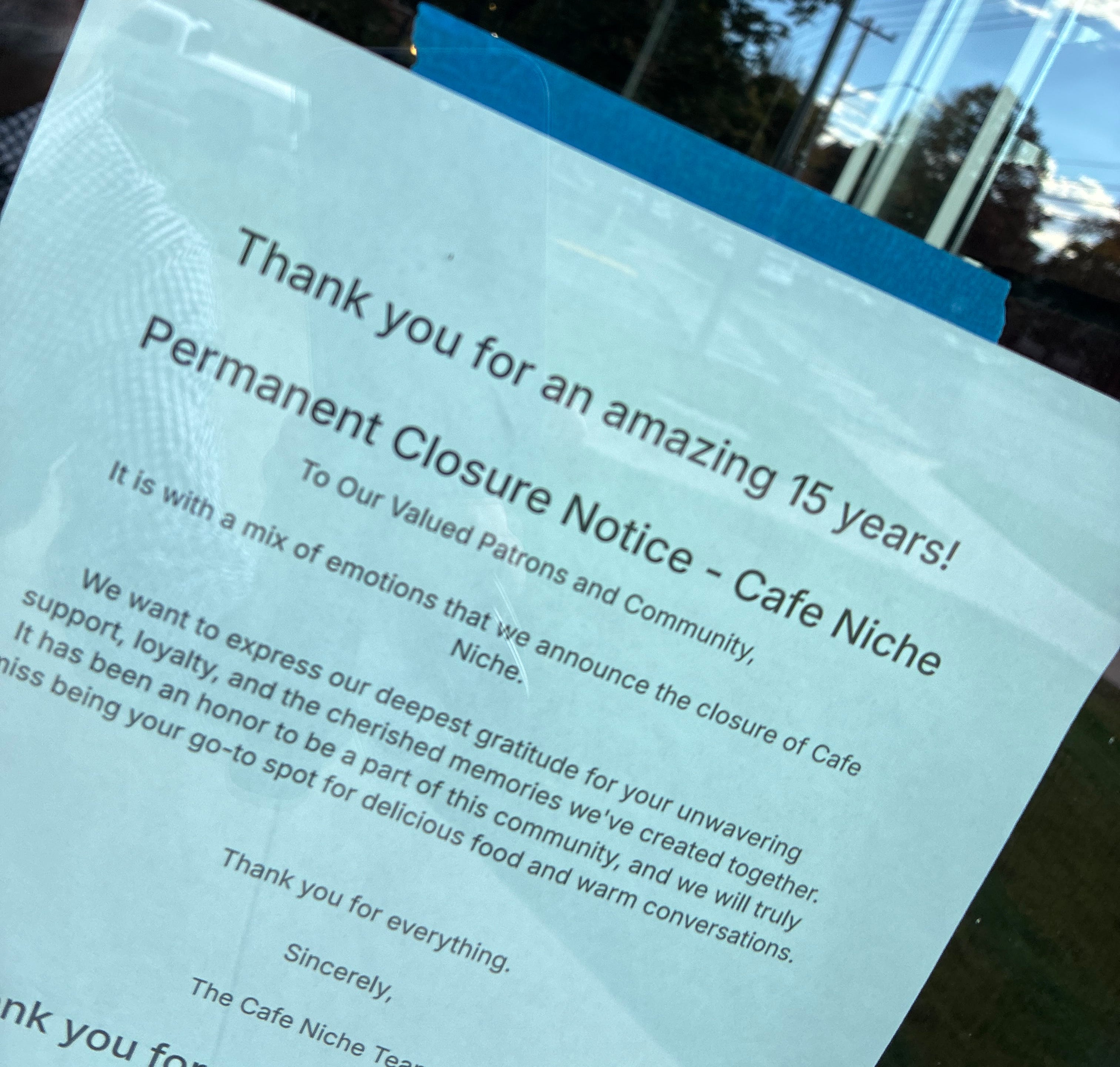 I had planned to meet a friend for coffee at Cafe Niche last month, and we were shocked when we arrived and saw a note on the door announcing the closure. Whether due to rising costs, staffing challenges, location issues, sheer exhaustion, or all of the above, I’m sad to see these local eateries go.